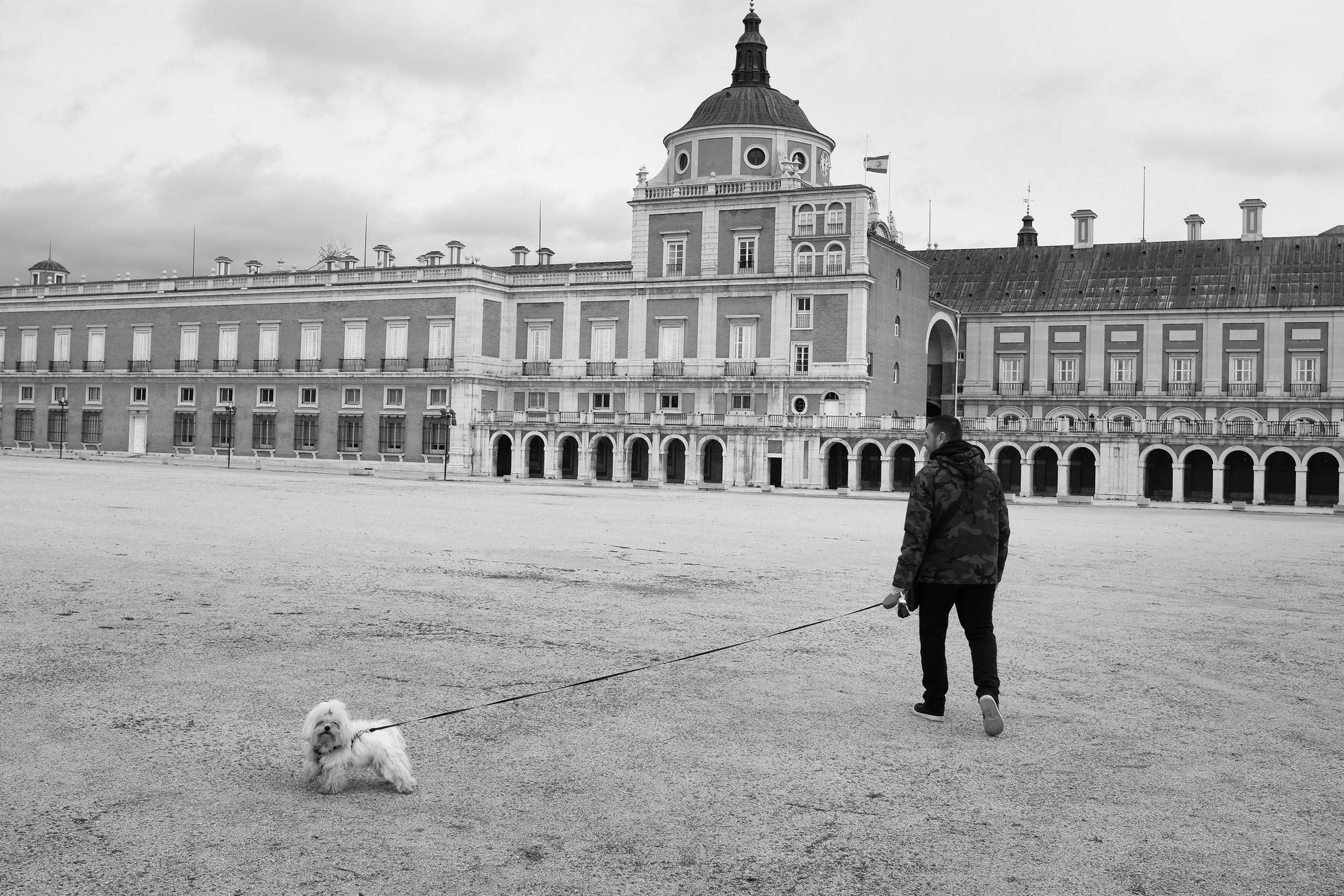 Un hombre pasea a su perro, solos, frente al Palacio Real durante el confinamiento.