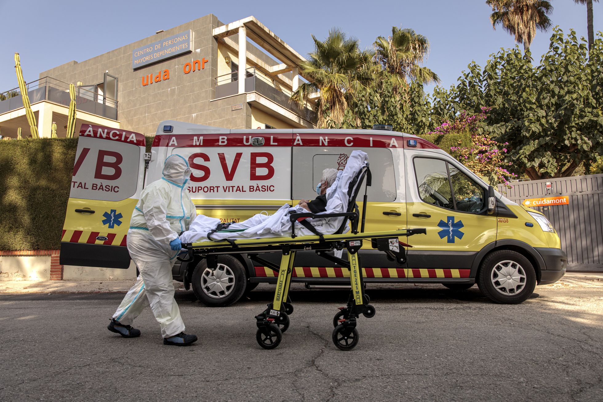 Una sanitaria protegida con un Equipo de Protección Individual (EPI) traslada una paciente a la residencia de mayores Cuidamont de la localidad valenciana de l’Eliana, donde se detectó un brote de coronavirus con catorce casos positivos en COVID-19: once residentes y tres trabajadores.