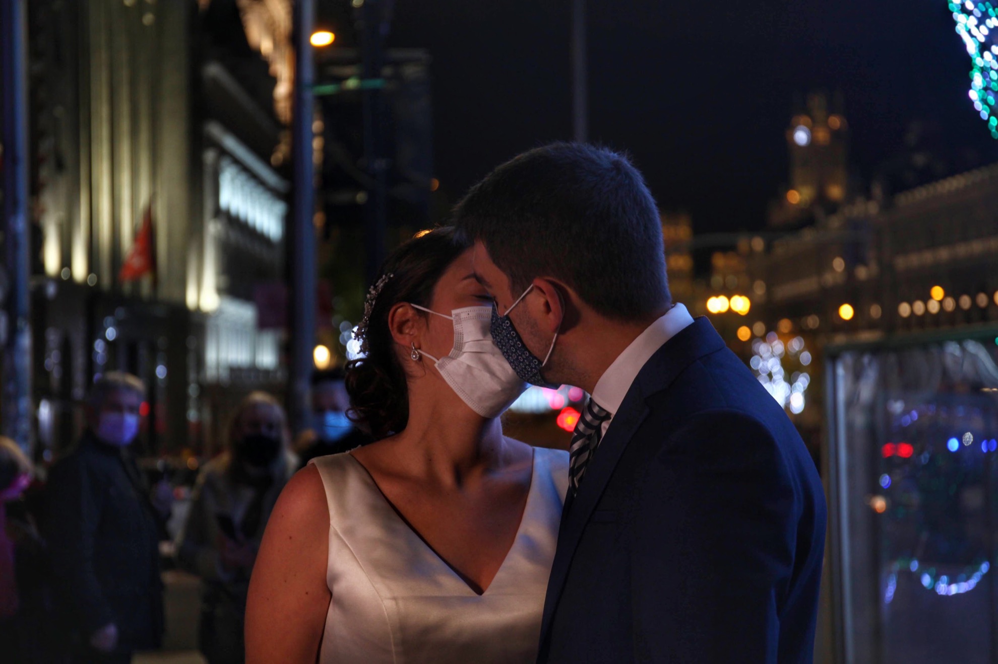 Una pareja de novios se besa con mascarilla mientras un fotógrafo les hace el reportaje para la boda. La pandemia supuso la anulación de miles de ceremonias en España que se retomaron con limitaciones en el segundo semestre de 2020.